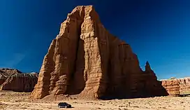 Temple of the Moon is composed of unfractured, buff-pink Entrada Sandstone.[4] The sandstone, which was originally deposited as sandy mud on a tidal flat, is believed to have formed about 160 million years ago during the Jurassic period as a giant sand sea, the largest in Earth's history.[6] Stratum in Cathedral Valley have a gentle inclination of three to five degrees to the east, and appear nearly horizontal. Long after these sedimentary rocks were deposited, the Colorado Plateau was uplifted relatively evenly, keeping the layers roughly horizontal, but Capitol Reef is an exception because of the Waterpocket Fold, a classic monocline, which formed between 50 and 70 million years ago during the Laramide Orogeny.[7]