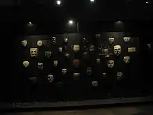 Wall display of stone masks found at the Templo Mayor site on display at the Templo Mayor museum.
