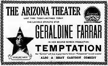 Temptation is a 1915 American silent romantic drama film directed and produced by Cecil B. DeMille. The film starred Geraldine Farrar and Theodore Roberts and was written by and based on an original story by Hector Turnbull. Additional writing was done by DeMille and Jeanie MacPherson, who did not receive screen credit.[1] Temptation is now considered a lost film.[3]