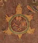 The mandala depicts the Buddhist realm of Tenjukoku (天寿国), or the "Land of Infinite Life", and presents a number of different elements representing various Buddhist concepts. The building in the bottom right is assumed by most scholars to represent the heavenly palace of Zenpōdō from the Maitreya Sutra. The main pattern of tortoises contains characters spelling the names of Shōtoku, Hashihito and Ōiratsume, arranged as a Buddhist triad,[8] and represents Shōtoku's genealogy; other tortoises contain further characters recorded in the Jōgū Shōtoku Hōō Teisetsu, including the death dates of Shōtoku and his mother, and the story of the mandala's creation.[9] The original version of the work contained 100 such tortoises.[5][3] An inscription, purportedly a statement by Shōtoku, was originally appended: "The world is folly. Only the Buddha is real."[10]