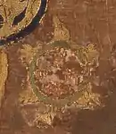 In the Jōgū Shōtoku Hōō Teisetsu, it is recorded that Tachibana no Ōiratsume, one of the widows of Prince Shōtoku, commissioned the mandala after her husband's death, to represent the heavenly realm to which he had departed so that she could envision his afterlife.[2] The artwork was created by maidservants of the Imperial Court, with the permission of the Empress Suiko.[3] The original was stitched in silk on a series of large square curtains, approximately 5 metres (16 ft) across,[4] but only a small portion of this, measuring approximately 89 centimetres (35 in) by 83 centimetres (33 in), still survives.[3][5][6]