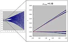 • A closer look at the orbit diagram shows that there are 4 separated regions at μ ≈ 1. For further magnification, 2 reference lines (red) are drawn from the tip to suitable x at certain μ (e.g., 1.10) as shown.