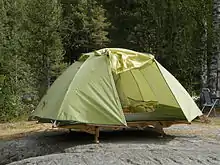 A tent platform is a floor for the purpose of pitching one or more tents upon. Typically, it is a wooden deck near a hiking trail that provides the hikers a clean and even place to sleep. It may also prevent the campers from trampling down the surrounding vegetation. Many campsites have tent platforms.[1][2] Mountaineers sometimes build tent platforms in their base camps from materials such as pebble or snow.