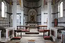 The interior features marble columns and pilasters which frame the polychrome marble tombs set against the walls. The space is lit by the single-light windows of the main façade and the side ones surmounted by oculi. The walls are designed with the same two-color bands over which the sapphire sky hangs. The design of the tombs is Renaissance style, with an arcosolium. Their architectural layout is based on the Bruni and Marsuppini sepulchres, both in the church of Santa Croce in Florence. The set of lines and materials also includes neo-fourteenth-century references evident in the monument to Carlo Ludovico, with the mixed-line conclusion containing the pointed arch lunette and the paneling of the tripartite back wall with trefoil motifs. The tomb of Roberto I is a sepulchral sarcophagus "in 15th century style".[71] Other tombs, one on top of the other, are spaced out by marble slabs in the short space of a cell, and remain illuminated by the silver gleam of a frosted glass window.