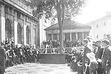 In late 1916 thanks to alliance with the Integrists[81] Arana with no opposing candidate was again elected to the senate,[82] the mandate which was prolonged in following elections of 1918. During both terms and less than 3 years[83] he was barely active in the chamber.[84] His most notable undertaking was an appeal for "reintegración foral", co-signed with other Basque senators and lodged with the prime minister, Manuel García Prieto. As it was not acted upon, Arana was among organizers of the grand Carlist rally, which materialized in 1918 as so-called Gran Asamblea de Zumárraga.[85] It declared autonomy as "medio transitorio" on the path towards the future foral system end called all parties operational in Vascongadas to join common efforts to get it restored.[86] Though a senator and a provincial Biscay leader, Arana did not play any role in Carlist national politics.[87]