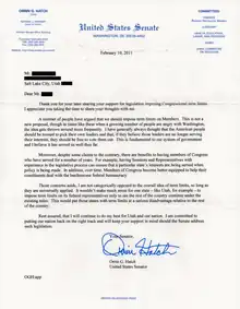 In the 1994 U.S. elections, part of the "Contract With America" Republican platform included legislation for term limits in Congress. After winning the majority, a Republican congressman brought a constitutional amendment to the House floor that proposed limiting members of the Senate to two six-year terms and members of the House to six two-year terms.[32] However, this rate of rotation was so slow (the life-tenured Supreme Court averages about 16 years) that the congressional version of term-limits garnered little support among the populist backers of term limits, including U.S. Term Limits, the largest private organization pushing for congressional term limits.[lower-alpha 4] The bill got only a bare majority (227–204), falling short of the two-thirds majority (290) needed for constitutional amendments.[33] Three other term limit amendment bills failed to get more than 200 votes.[lower-alpha 5]