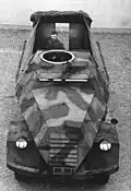 While always intended for fixed armament, featuring a round hatch sized hole on the cabin roof, the vehicles initially lacked any permanent such and the cabin roof hole was often bolted over with a metal plate.[1] Instead the vehicles were outfitted with storage for the weaponry, munition and equipment of the panzergrenadiers, such as machine guns, hand grenades and man-portable anti-tank systems, etc. One vehicle was early on at one point trialed with a 20 mm akan m/40 autocannon, but the first standard fixed armament was a single ksp m/39 machine gun fitted in a rotating turret ring on top of the cabin sometime during the second half of the 1940s.[4] This machine gun could fire either the 8×63mm m/32 machine gun cartridge or the 6.5×55mm m/94 rifle cartridge depending on the barrel fitted.