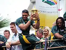 South Africa has also produced numerous world class rugby players, including Francois Pienaar, Joost van der Westhuizen, Danie Craven, Frik du Preez, Naas Botha and Bryan Habana. South Africa hosted and won the 1995 Rugby World Cup and won the 2007 Rugby World Cup in France as well as the 2019 Rugby World Cup in Japan. It followed the 1995 Rugby World Cup by hosting the 1996 African Cup of Nations, with the national team going on to win the tournament. It also hosted the 2003 Cricket World Cup, the 2007 World Twenty20 Championship, and it was the host nation for the 2010 FIFA World Cup, which was the first time the tournament was held in Africa. FIFA president Sepp Blatter awarded South Africa a grade 9 out of 10 for successfully hosting the event.[25]