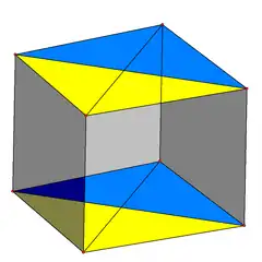 An orthographic projection showing the pair of parallel tetrahedra projected as a quadrilateral divided into yellow and blue triangular faces. Each tetrahedra also have two other uncolored triangles across the opposite diagonal.