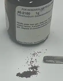 - ↑ S. Martinengo; G. Giordano; P. Chini (1990). "Tri-µ-carbonyl-nonacarbonyltetrarhodium". Inorganic Syntheses. 28: 242–245. doi:10.1002/9780470132593.ch62.