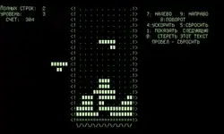 Because the Electronika 60 had no graphical interface, Pajitnov modelled the field and pieces using spaces and brackets[18]: 299 (45 lines of 80 ASCII characters).[13]1:50 Realizing that completed lines filled the screen quickly, Pajitnov decided to delete them, creating a key part of Tetris gameplay.[20] This early version of Tetris had no scoring system and no levels, but its addictive quality distinguished it from the other puzzle games Pajitnov had created.[22] Pajitnov wrote the game using Pascal for the RT-11 operating system on the Electronika 60.[13]1:50