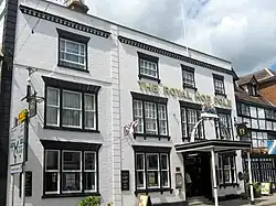 Tewkesbury claims Gloucestershire's oldest public house, the Black Bear, dating from 1308.[9] The pub closed in 2017 and after undergoing renovation from 2019 to 2022, reopened in 2023.[10] Other notable large hostelries are the Royal Hop Pole Hotel in Church Street (which has recently been converted into a part of the Wetherspoons pub chain with the discovery of a former medieval banqueting hall in the structure), mentioned in Charles Dickens' The Pickwick Papers, the Bell Hotel, a large half-timbered structure opposite the Abbey gateway, and the House of the Nodding Gables in the High Street.