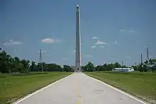 PR 1836 begins at an intersection with Independence Parkway near several oil refineries in Houston, Harris County. From here, the park road heads northeast along two-lane undivided Juan N. Seguin Boulevard onto the grounds of San Jacinto Battleground State Historic Site, passing through a park gate. The PR 1836 designation extends along all the roads on the park grounds.[2][3] Marker Drive leads northwest from Juan N. Seguin Boulevard and serves the park headquarters and the site of the USS Texas. Juan N. Seguin Boulevard continues northeast and loops around the San Jacinto Monument as Monument Circle. Another branch of PR 1836 heads southeast from the intersection of Juan N. Seguin Boulevard and Marker Drive and turns north before reaching a dead end adjacent to the Marsh and Wetlands Habitat. Another section of the park road runs from Monument Circle southeast alongside the Marsh and Wetlands Habitat before turning southwest to intersect the easterly branch of PR 1836.[3][4]