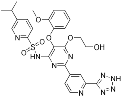Tezosentan is a non-selective ETA and ETB receptor antagonist.[1] It acts as a vasodilator and was designed by Actelion as a therapy for patients with acute heart failure. However, studies showed that tezosentan did not improve dyspnea or reduce the risk of fatal or nonfatal cardiovascular events.[2]