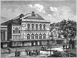 The Théâtre de la Gaîté, a former Parisian theatre company,[5] was founded in 1759 on the boulevard du Temple by the celebrated Parisian fair-grounds showman Jean-Baptiste Nicolet as the Théâtre de Nicolet, ou des Grands Danseurs.[6][7] The company was invited to perform for the royal court of Louis XV in 1772 and thereafter took the name of Grands-Danseurs du Roi. However, with the fall of the monarchy and the founding of the First French Republic in 1792, the name was changed to the less politically risky Théâtre de la Gaîté.[8] The company's theatre on the boulevard du Temple was replaced in 1764 and 1808, and again in 1835 due to a fire. As a result of Haussmann's renovation of Paris, the company relocated to a new theatre on the rue Papin in 1862, and the 1835 theatre (pictured) was subsequently demolished.