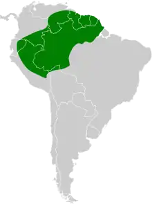 It is found in Bolivia, Brazil, Colombia, Ecuador, French Guiana, Guyana, Peru, Suriname, and Venezuela. Its natural habitat is subtropical or tropical moist lowland forests.