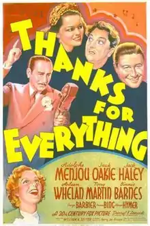 Thanks for Everything is a 1938 American comedy film directed by William A. Seiter, written by Curtis Kenyon and Harry Tugend, and starring Adolphe Menjou, Jack Oakie, Jack Haley, Arleen Whelan, Tony Martin and Binnie Barnes.[1][2][3] It was released on December 23, 1938 by 20th Century-Fox.