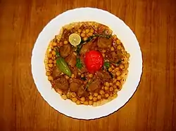 Tharid (Arabic: ثريد, also known as trid, taghrib, tashreeb or thareed) is a bread soup that originates from Mecca, Saudi Arabia, an Arab cuisine also found in many other Arab countries. Like other bread soups, it a simple meal of broth and bread in this instance crumbled flatbread moistened with broth or stew.[1] Historically, the flatbread used was probably stale and unleavened.[2] As an Arab national dish it is considered strongly evocative of Arab identity during the lifetime of the Islamic prophet Muhammad. According to a widespread legend, this unremarkable and humble dish was the prophet's favorite food.[3]