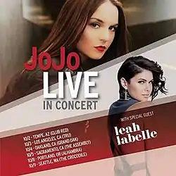 In an interview with TheYoungFolks.com on January 4, 2013, JoJo expressed plans to go on a nationwide tour hitting the East Coast, Canada and other cities in the USA. She met with her agency in January to sort out a specific route for the tour.[2] On August 28, 2013 JoJo announced the first five West Coast tour dates entitled The "Agape Tour" via her official Twitter page with special guest Leah Labelle as the opening act. Tickets went on sale the same day.[3]