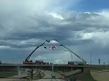 • Roadblock: "Who's going to fall for this road block?" In this leg's first Roadblock, one team member had to climb down a cargo net suspended from the pedestrian bridge over Montmorency Falls in order to retrieve their next clue, and then climb back up to reunite with their partner.