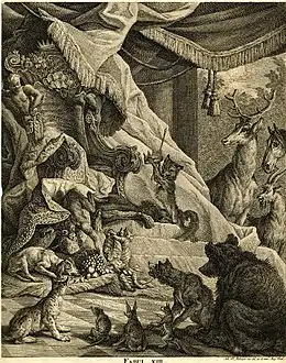 A more novel approach to illustrating the fable’s message was taken by Johann Elias Ridinger in his Instructive Fables from the Animal Kingdom for the Improvement of Manners and especially the Instruction of Youth (1744). There the fox has just raised the crown in a coronation ceremony before the assembled beasts, when the ape causes consternation by diving from the throne in pursuit of a platter of fruit. The print is accompanied by the explanation that "a high social position is not always matched by intelligence".[22] Although such a sentiment matches the commentary in several fable collections, the actual scenario comes closer to that of "The Dancing Monkeys".