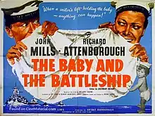 The Baby and the Battleship is a colour 1956 British comedy film directed by Jay Lewis and starring John Mills, Richard Attenborough and André Morell.[2] It is based on the 1956 novel by Anthony Thorne with a screenplay by Richard De Roy, Gilbert Hackforth-Jones and Bryan Forbes. The Royal Navy provided much cooperation with sequences filmed aboard HMS Birmingham and in Malta.