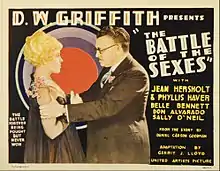 The Battle of the Sexes is a 1928 American synchronized sound comedy film directed by D. W. Griffith. While the film has no audible dialog, it was released with a synchronized musical score, singing and sound effects using both the sound-on-disc and sound-on-film process. The film starred Jean Hersholt, Phyllis Haver, Belle Bennett, Don Alvarado, and Sally O'Neil. It was released by United Artists. The film was a remake by Griffith of an earlier film he directed in 1914, which starred Lillian Gish. Both films are based on the novel The Single Standard by Daniel Carson Goodman; the story was adapted for this production by Gerrit J. Lloyd.[4]