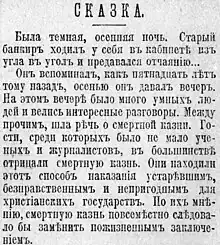 Divided into three parts, it appeared in the 1 January 1889, No. 4613 issue of Novoye Vremya, titled "Fairytale" (Сказка). With a new title, "The Bet", revised and cut with part 3 of the original text now gone, it was included in Volume 4 of Chekhov's Collected Works, published in 1899–1901 by Adolf Marks.[2] Chekhov explained the reason for the omission in 1903: "As I was reading the proofs, I came to dislike the end, it occurred to me that it was too cold and cruel."[3]