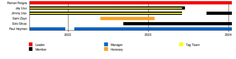 | Members | Roman Reigns (leader) Jimmy Uso Solo Sikoa Paul Heyman (manager) |