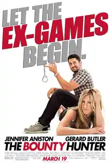 The Bounty Hunter is a 2010 American romantic action comedy directed by Andy Tennant, starring Jennifer Aniston and Gerard Butler. The story centers on a bounty hunter hired to retrieve his ex-wife, who has skipped bail. The film was released in the United States on March 19, 2010.[5] The film received negative reviews from critics but was a box office success, grossing $136.3 million against a production budget of $40–45 million.