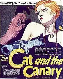 Although not the first film set in a supposed haunted house, The Cat and the Canary started the pattern for the "old dark house" genre.[31] The term is derived from English director James Whale's The Old Dark House (1932), which was heavily influenced by Leni's film,[15] and refers to "films in which murders are committed by masked killers in old mansions."[32] Supernatural events in the film are all explained at the film's conclusion as the work of a criminal. Other films in this genre influenced by The Cat and the Canary include The Last Warning, House on Haunted Hill (1959), and the monster films of Abbott and Costello and Laurel and Hardy.[33][34]