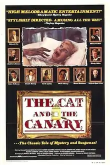 The Cat and the Canary is a 1978 horror film directed by Radley Metzger and starring Honor Blackman, Michael Callan, Edward Fox, Wendy Hiller, Olivia Hussey, Wilfred Hyde-White, Beatrix Lehmann, Carol Lynley, Daniel Massey, and Peter McEnery. It follows a group of potential heirs who are summoned to the mansion of a deceased beneficiary to view the filmed reading of his will, only to discover upon arrival that a deranged killer may have infiltrated the event.