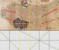 Projection of module 10 used by Cerdá for the layout of the main and diagonal roads. In red, are some of the old roads that have survived the Cerdá grid.