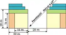 The dimensions of the blocks are given by the aforementioned distances between the longitudinal axes of the streets and the same width of these roads, so that by establishing a standard width of 20 meters, the blocks are formed by quadrilaterals of 113.3 meters, their vertices truncated in the form of a chamfer of 15 meters, which gives a block area of 1.24 hectares, contrary to popular belief that they have an exact area of 1 hectare. The figure of 113.3 meters has had various justifications. Manuel de Solà-Morales considers that the 5 blocks between the old bastion of Tallers (now Plaça Universitat) and that of Jonqueres (now Plaça Urquinaona) are the ones that mark the factor from which the rest is built.[27]