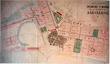 • Other projects: The project of Josep Massanès and that of José María Planas proposed a mere extension while maintaining the wall around the new space. The latter had a similarity with the project presented by the "owners of the Paseo de Gracia" since both projects were based on a mere extension on both sides of the Paseo de Gracia. Two other simpler projects were that of Tomás Bertrán Soler, who proposed a new neighborhood in place of the Citadel, converting the Passeig de Sant Joan into an axis similar to the Rambla; and a very elementary one attributed to Francisco Soler Mestres, who died three days before the reading of the prizes.[19]