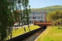 Photograph of The Chase School. A view of the stream in front of the Science Block with the Malvern Hills in the background.