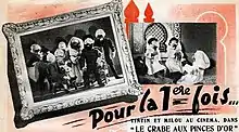 The Crab with the Golden Claws (French: Le crabe aux pinces d'or) is a 1947 Belgian stop motion feature film produced by Wilfried Bouchery for Films Claude Misonne and based on the comic book of the same name from The Adventures of Tintin by Hergé. This was the first Tintin story to be adapted into a movie and follows the story of the comic almost exactly.