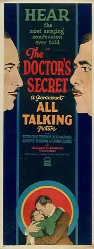 The Doctor's Secret is a 1929 American drama film directed by William C. deMille and written by William C. deMille. The film stars Ruth Chatterton, H. B. Warner, John Loder, Robert Edeson, Wilfred Noy and Ethel Wales. It is based on the 1913 play Half an Hour by J. M. Barrie.[1][2] The film was released on January 26, 1929, by Paramount Pictures. As part of the policy of multiple-language versions during the early sound era, a separate Swedish version was produced at the Joinville Studios in Paris and released the following year.