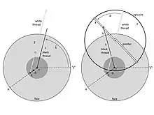 The text describes the construction of an equatorium, an instrument comparable to the astrolabe – but where an astrolabe shows the positions of the stars, an equatorium computes them for the planets, according to the Geocentric model of Ptolemy.[25] The instrument is constructed from two discs, six feet in diameter. One of them is solid, and is marked with characteristics of the orbits of the various planets: their apogee, their equants, and other centres. The other disc consists of "a ring, a diametral bar, and a rule pivoted at the centre of the bar". The two discs are joined and simulate the motions of each of the planets. A divided circle around the rims of the two discs allow for the transferral of information from sets of tables (the Alfonsine tables, from a Parisian document) that contain the data for each planet.[19]