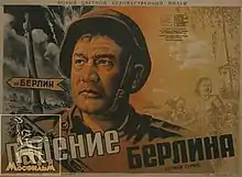 The Fall of Berlin (Russian: Падение Берлина, romanized: Padeniye Berlina) is a 1950 Soviet war and propaganda film, in two parts separated in the manner of a serial.[1] It was produced by Mosfilm Studio and directed by Mikheil Chiaureli, with a script written by Pyotr Pavlenko and a musical score composed by Dmitri Shostakovich. Portraying the history of the Second World War with a focus on a highly positive depiction of the role Soviet dictator Joseph Stalin (played by Mikheil Gelovani) played in the events, it is considered one of the most important manifestations of Stalin's cult of personality, and a noted example of Soviet realism. After De-Stalinization, the film was banned in the Eastern Bloc for several decades.