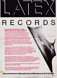 In July 1985, Czezowski and Carrington launched their own Record Company, Latex Records. located at the Fridge. Yvette the Conqueror was the first artist signed to the label. The label's first release was a single by Yvette the Conqueror, titled "The Boys Were There",[8] produced by Iain 'Rudi' Williams (from the bands You You You and Big Bang).[9] Czezowski and Carrington also promoted many bands at the Fridge, one of which was the cult club-band You You You featuring club promoter Laurence Malice, Karen O'Connor and Iain 'Rudi' Williams. The band performed a sell-out concert at the Fridge on 27 March 1987, at which Czezowski had a huge white staircase built on the stage for the band to perform on.[10][11] The show was filmed for Japanese television. Since then it has hosted a variety of club nights most notably Soul II Soul (1988 - 1993) Daisy Chain (1987-1990) and Escape From Samsara (1995-2005).