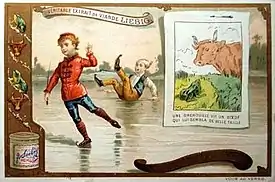 The fable was a favourite in England and was put to popular use on 18th century china by the Fenton pottery[13] and in the 19th century by the Wedgwood pottery. This was on its Aesop series of coloured plates, signed by Emile Lessore in the 1860s.[14] Minton's pottery also used the fable on a series of Aesop tiles a little later. In France a biscuit porcelain figure group illustrating the fable was issued by the Haffreingue porcelain factory at Boulogne between 1857–1859. The ox is modeled lying on the ground and looking down at the frog directly in front.[15]