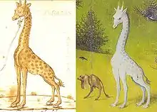 To the left of the area a cat holds a small lizard-like creature in its jaws. Belting observes that, despite the fact that the creatures in the foreground are fantastical imaginings, many of the animals in the mid and background are drawn from contemporary travel literature, and here Bosch is appealing to "the knowledge of a humanistic and aristocratic readership".[22] Erhard Reuwich's pictures for Bernhard von Breydenbach's 1486 Pilgrimages to the Holy Land were long thought to be the source for both the elephant and the giraffe, though more recent research indicates the mid-15th-century humanist scholar Cyriac of Ancona's travelogues served as Bosch's exposure to these exotic animals.[22]