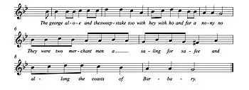 The American variant The Coast of High Barbaree includes only one ship, which exchanges hails with a Barbary pirate and defeats it, as the George Aloe does with the French ship.[1]