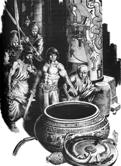 Carson Ward commented further: "A more fitting term would be an anti detective story- since it turns upside down the basic conventions of the genre. It begins in normal detective story fashion - a murder is discovered, the police arrives, a rationalist detective (Dionus) starts a thorough investigation, discards red herrings, and looks for the real culprit. But in total opposition to the conventional ending of a detective story - i.e, the detective solving the mystery and triumphantly apprehending the culprit - 'God in Bowl' ends with the forces of law and order totally routed, detective and constables fleeing the scene in panic. The stage is left to the clash of primeval forces, the barbarian from the north against the sinister magic from the south. The outcome is entirely due to Conan's sword-arm. The laws and criminal procedures of the surrounding city and kingdom are effectively nullified."[3] (Ward probably meant Demetrio, not Dionus, given the roles played by both characters in the story. Demetrio plays the more rational and evidence-oriented authority.)