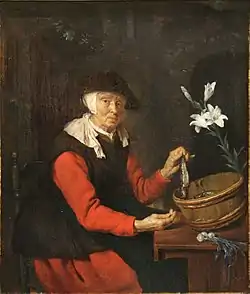 The central figure is a woman dressed in the red and blue colors often associated with market-sellers in the 17th-century Northern Netherlands. Like other contemporary painters, Metsu has chosen the subject of raw herring and onions, a favorite Dutch snack still sold on Dutch street markets today. The motif is also one that Metsu returned to regularly, possibly painted for inns where customers could be tempted to order such a snack.[1]