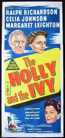 The Holly and the Ivy is a 1952 British drama film directed by George More O'Ferrall and starring Ralph Richardson, Celia Johnson, and Margaret Leighton.[4] It was adapted from the 1950 play of the same name by Wynyard Browne.[5] Produced by Anatole de Grunwald and co-scripted by Browne and de Grunwald it was distributed by British Lion Films, and released in the United States in 1954 by the independent Pacemaker Pictures. An Irish clergyman whose neglect of his grown offspring, in his zeal to tend to his parishioners, comes to the surface at a Christmas family gathering.