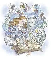 The book was illustrated by Laurel Long in a style inspired by Victorian illustrators Arthur Rackham and Maxfield Parrish.[4] Another major influence on the art style is Northern Renaissance painting, and illustrations of the villain, Herrikhan, draw on the supernatural creatures of Ukiyo-e artwork.[5]