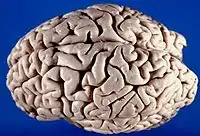 Superior-lateral view of the brain, showing left and right hemispheres.