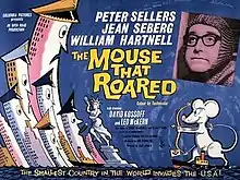 The Mouse That Roared is a 1959 British satirical comedy film on a Ban The Bomb theme, based on Leonard Wibberley's novel The Mouse That Roared (1955).[4] It stars Peter Sellers in three roles: Duchess Gloriana XII; Count Rupert Mountjoy, the Prime Minister; and Tully Bascomb, the military leader; and co-stars Jean Seberg. The film was directed by Jack Arnold, and the screenplay was written by Roger MacDougall and Stanley Mann.